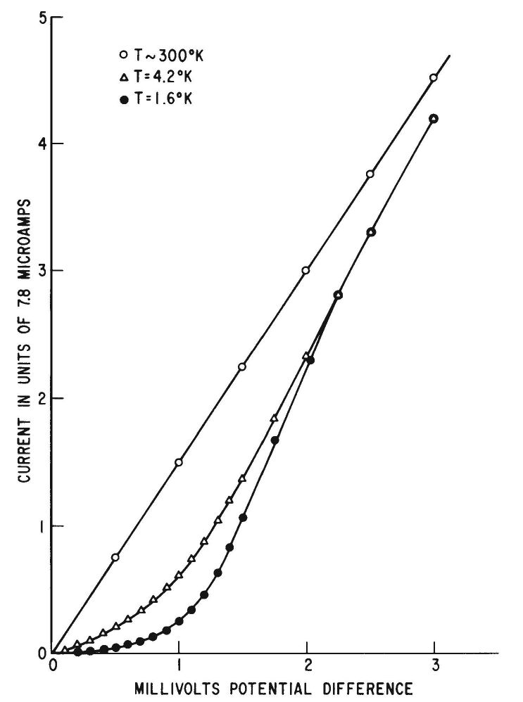 图7 铝-氧化铝-铅样品的伏安特性曲线。当铅进入超导态后,电流不再正比于电压。在4.2K与1.6K之间存在较大的变化是因为超导能隙是随温度变化的。当外加电压提供的电势能小于能隙的一半时仍然有一些电流存在是因为导体中电子的热激发。