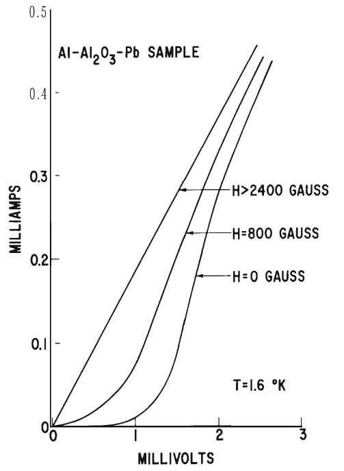 图8 在1.6K时,不同外加磁场下的伏安特性曲线。在2400高斯时,铅薄膜处于正常态,在0高斯时铅薄膜处于超导态。在800高斯和0高斯之间的变化是由于超导能隙随外加磁场变化。
