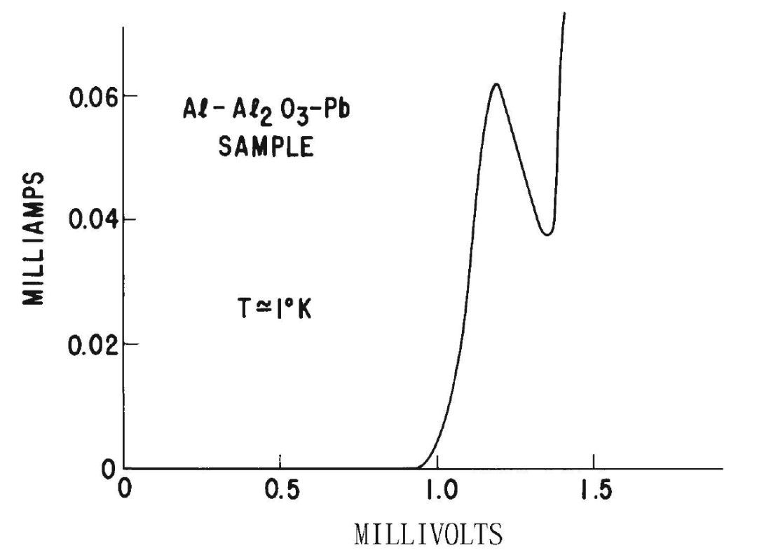 与此同时,我完成了自己在RPI的课程,并决定和亨廷顿教授一起做一个关于有序-无序合金的理论课题,因为我们已经基本理解了超导中的隧穿效应。后来有人提醒我布莱恩·约瑟夫森(Brian Josephson)在《物理学快报》上发表了一篇短文—我当时是怎么想的呢? 嗯,我没看懂。但是不久之后我有机会在剑桥见到了约瑟夫森本人并对他的工作留下了深刻的印象。约瑟夫森预测的其中一个效应是,当两侧的金属都处于超导态时,有可能会有零压降的超流通过氧化物势垒。现在这个现象被称为直流约瑟夫森效应。我们已经有很多次测量到这种行为了,事实上,当测量“锡-氧化锡-锡”结或“铅-氧化铅-铅”结时,很难看不到这种电流。早期的隧穿结通常使用氧化铝,而氧化铝一般是比较厚的,因此热涨落抑制了直流电流。在麦格尔和我的第一篇论文中有这样一条曲线,如图13所示,展示的就是这样的一个超流,而且它强烈依赖于磁场。然而,当时我对这个现象有一个现成的解释,那就是金属电极的短路。那时候我就很困惑,因为按理说这样一个小的接触不该有如此的磁场敏感度,不过并没有人知道一个20Å长,20Å宽的接触会有什么现象。如果说作为一个科学家我学到了哪些东西的话,那就是当一个简单的解释就可以解决问题时,不应该把事情复杂化。因此,所有我们制作的观测到了约瑟夫森效应的样品都被当作短路的样品而废弃了。但显然这次我想的太简单了!后来我被问过很多次,是否为错过了这个效应而感到难过?答案当然是不,因为仅仅观测到一些现象并不能够称作在实验上有所发现,我们还必须认识到现象背后的物理意义,而在这个例子中我甚至都没有接近这一点。即便在我真正地了解了直流约瑟夫森效应之后,我仍然觉得它与短路是无法区分的,因此我曾错误地认为只有观测到交流约瑟夫森效应才能证实或者证伪约瑟夫森的理论。