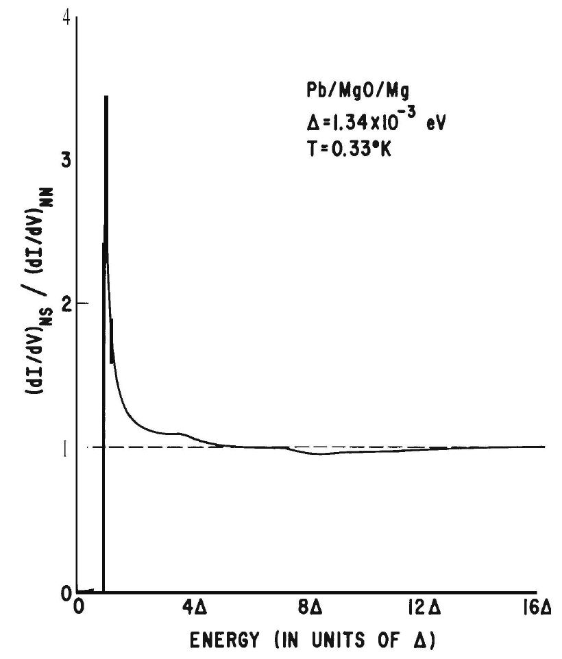 图12 铅结在低温下的归一化微分电导。简单的BCS理论可以预测,随着能量的增加,微分电导应渐近于一个单位。但相反的是,在4倍超导能隙到8倍超导能隙之间我们可以观察到几个摆动。这些摆动与铅中的声子谱有关。