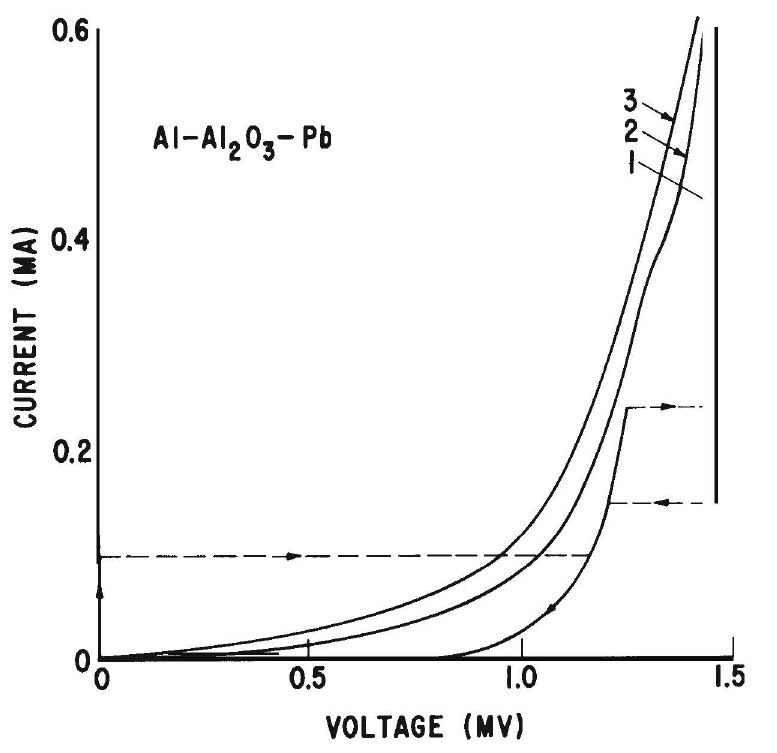图13 束缚磁场对隧穿特性的影响。曲线1为初态曲线,曲线3中有中等大小的磁场,曲线2中磁场已被去掉。在曲线l中有一个很小的无耗散电流,我们认为这是由于金属短路造成的。但现在回想起来,这其实是由于约瑟夫森效应!