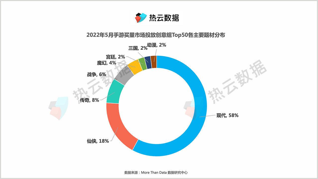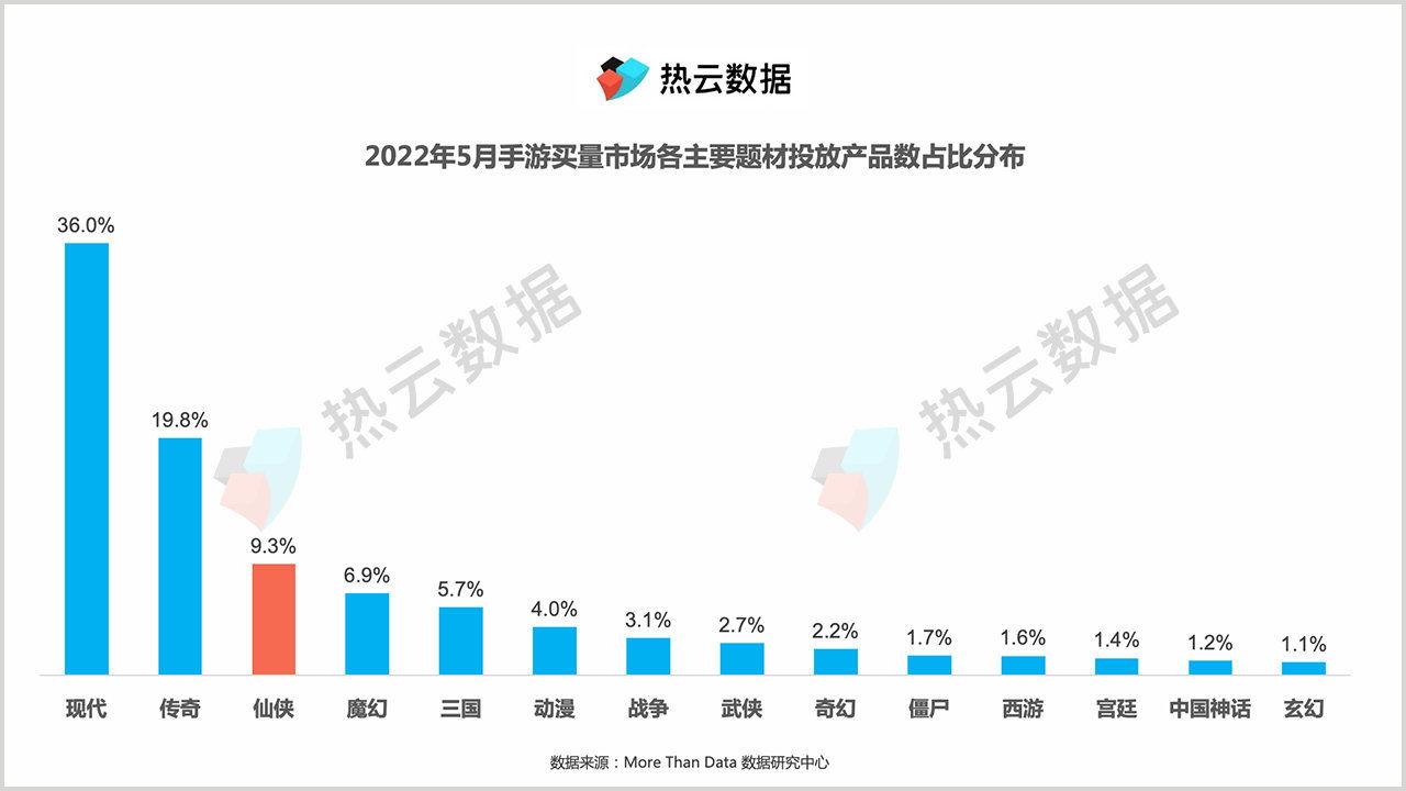 从大盘数据来看,在2022年5月手游买量市场各主要题材投放产品数占比分布方面,虽然仙侠题材位居总榜Top3,在现代和传奇之后,但与Q1相比出现了小幅增长,整体处在稳中有升的发展趋势之中。同时,热云数据发现,在2022年5月手游买量市场投放创意组Top50各主要题材分布方面,仙侠类超过传奇类提升至第二位,仅落后于现代。也就是说,仙侠题材在头部买量手游的表现上优于整体大盘数据,一些投放力度极大的手游带动了整个类别的排名。