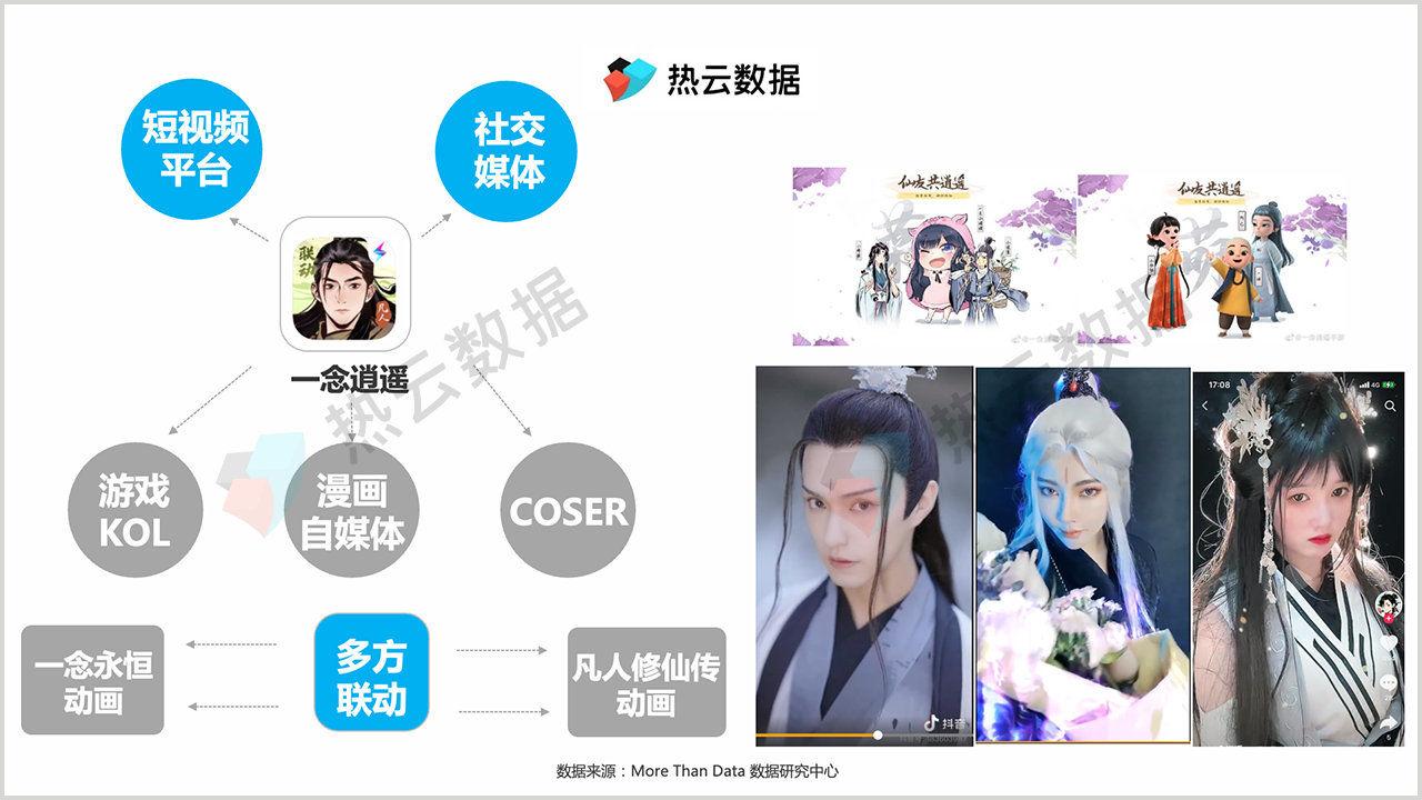 对于成熟的游戏厂商来说,在预算充足的情况下,多数采用的是广撒网的营销方式。比如《一念逍遥》,除抖音以外,微博、微信等社交媒体同样是其主要宣传平台,同时,与游戏领域KOL、漫画自媒体和COSER等都有广泛合作。此类手游特别注重通过“多方联动”来提升手游本身的影响力。