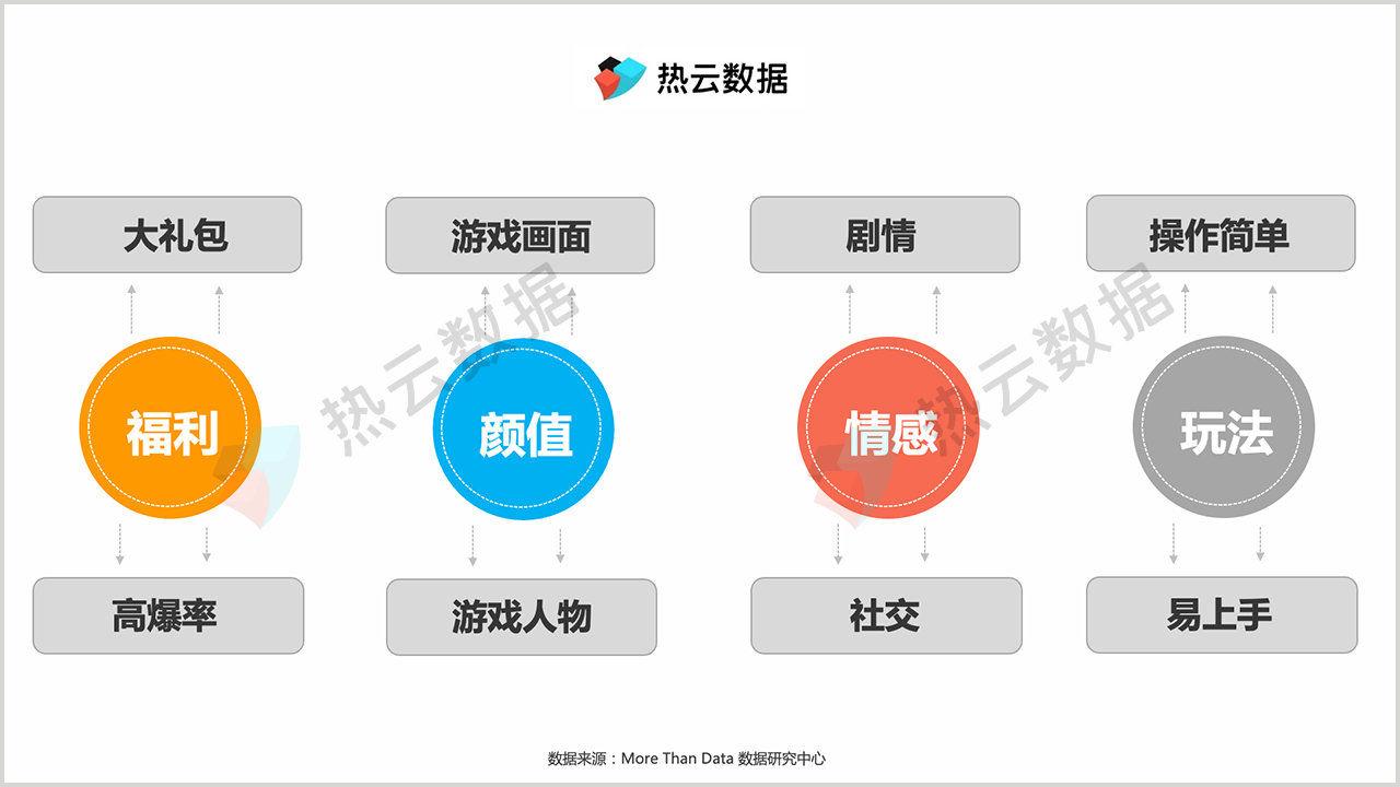 在投放内容方面,整体上看,仙侠题材手游有一定的共通之处,其中,“福利”、“颜值”、“情感”与“玩法”这四大元素出现频次较多。 具体来看,免费送、大礼包、高爆率等游戏初始福利仍是吸引玩家的不二法宝,除此之外,游戏人物与游戏画面的高颜值、游戏中剧情和情感的羁绊以及简单易上手的玩法也是投放的主要内容。