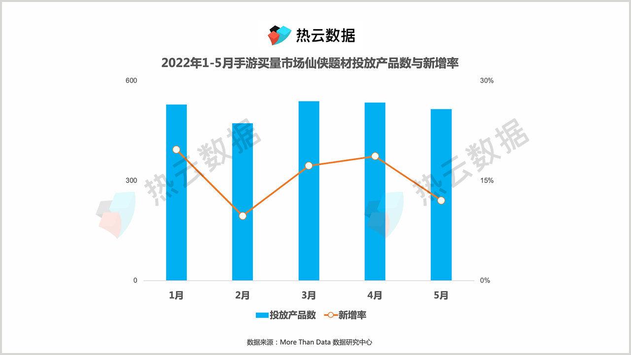 仙侠题材手游在今年买量市场的投放热度一直居高不下。基于其中国传统文化的背景、精美的人物和场景展现、鲜活的游戏剧情以及难度适中的玩法受到了众多玩家的喜爱。从广告投放的角度来看,仙侠题材手游一直比较稳定。根据热云数据C.A.S广告素材智能分析系统数据,从2022年1-5月手游买量市场仙侠题材投放产品数与新增率上看,月均投放产品数接近520款,各月投放数值相差较小,新增率均值稳定在15%左右,其中,春节前及五一前新投放产品数出现明显上涨。