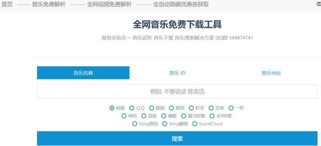 全网音乐免费下载网多站合一音乐搜索解决方案,可搜索试听网易云音乐、QQ音乐、酷狗音乐、酷我音乐、虾米音乐、百度音乐、一听音乐、咪咕音乐、荔枝FM、蜻蜓FM、喜马拉雅FM、全民K歌、5sing原创翻唱音乐。