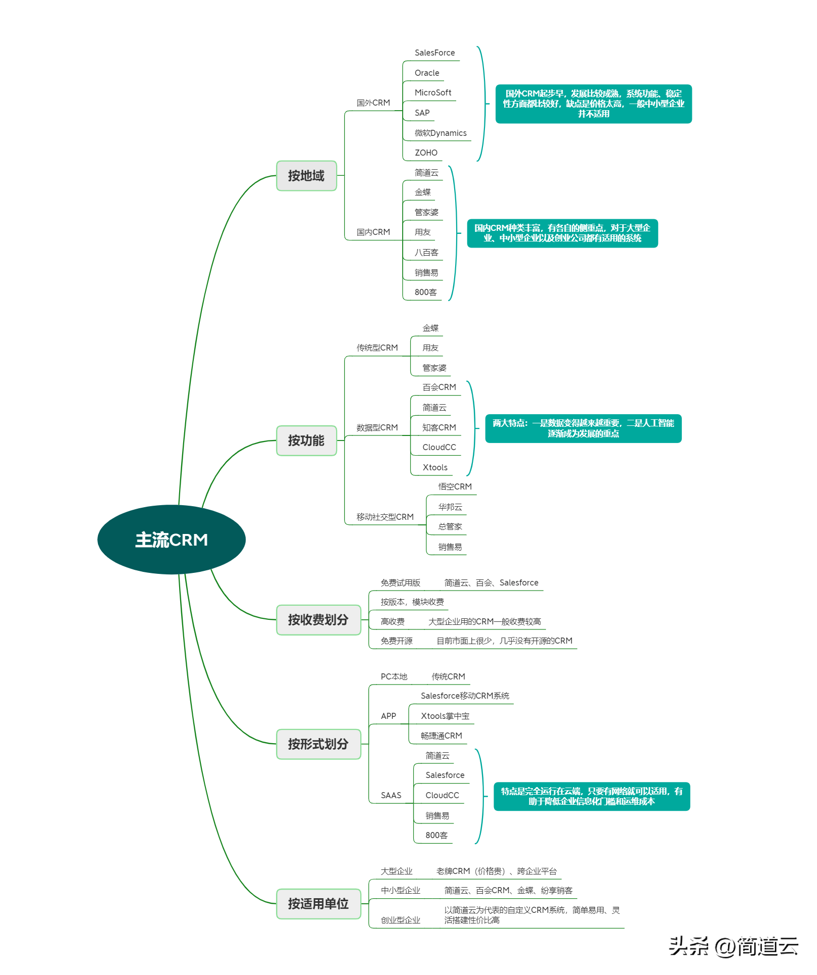 这里和大家分享一个思维导图,将市面上主流CRM产品从地域、功能、形式、收费这四个方面进行归类划分,下面将主要从地域进行详细的分类评价: