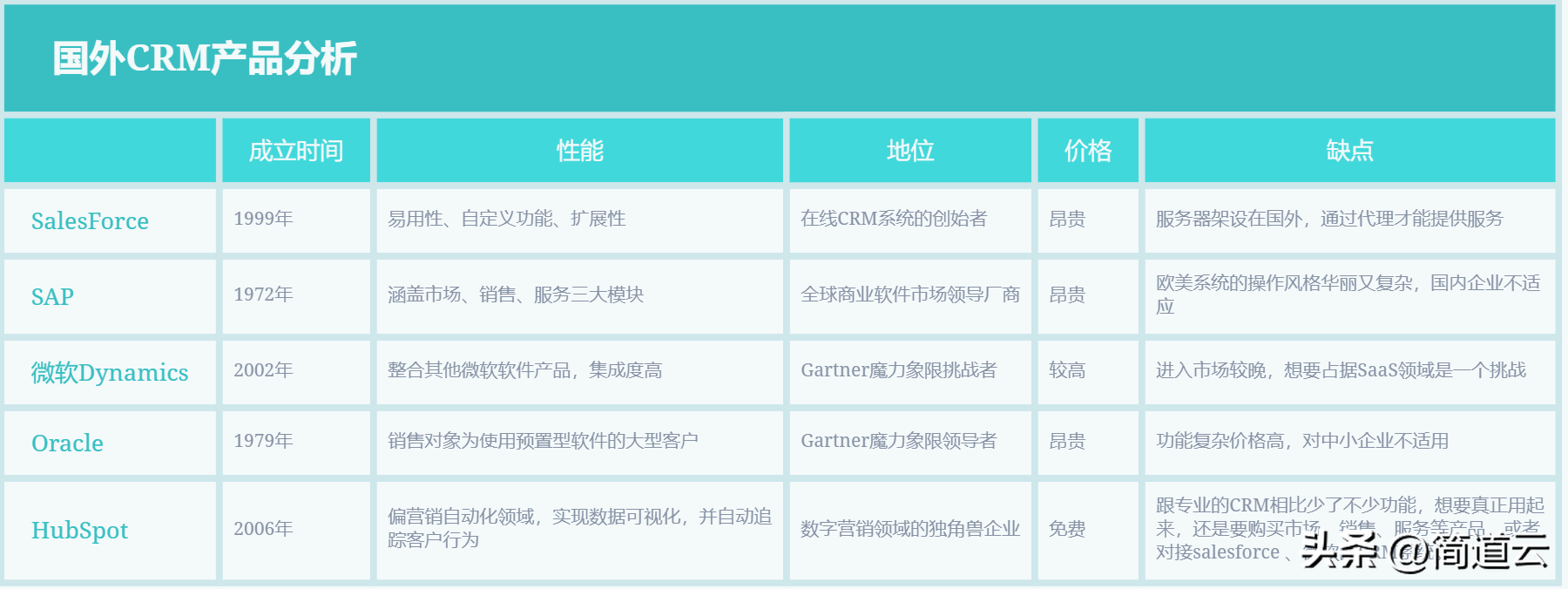 以Salesforce、Oracle、SAP、Microsoft、微软Dynamics为代表,其中,Salesforce和SAP、Oracle分别入选2020-2021年Gartner魔力象限。