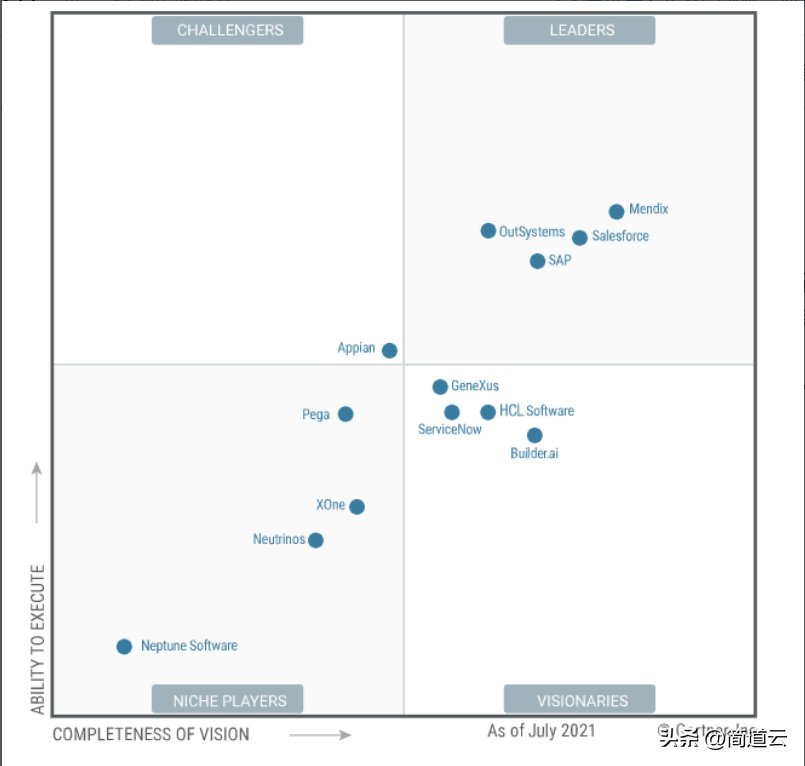 这里稍微说一下魔力象限,Gartner魔力象限是监测和评估专业科技市场中公司的发展及定位的一种研究方法论和形象化工具,使用二维模型去阐释公司间的实力及差异,将构成竞争的公司分成四个不同的部分(利基者、有远见者、挑战者、行业领袖)。