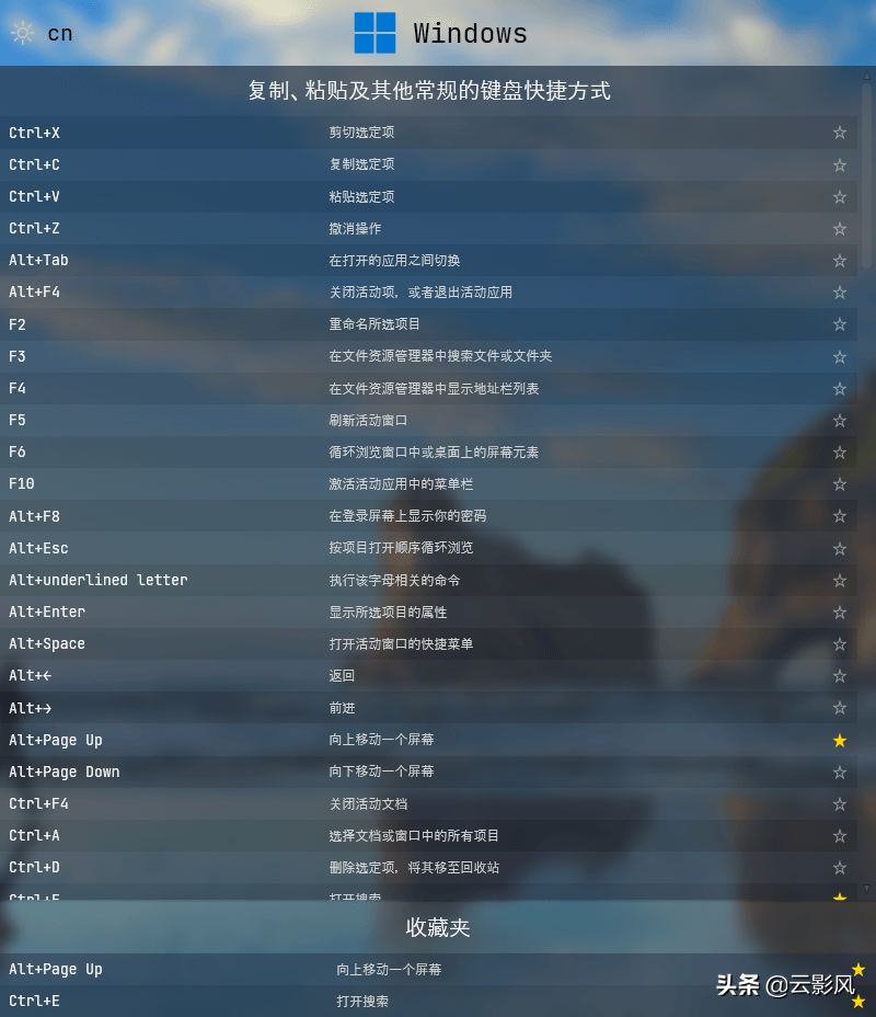 在使用其他程序的时候,只要按下按钮 Ctrl+` 就可以理解弹出该软件的所有快捷键列表,还支持收藏功能,非常快速高效。