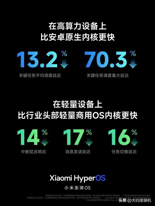 在性能方面,小米的澎湃 OS 也经过了大幅优化,在高算力设备上声称比安卓原生内核更为快速。