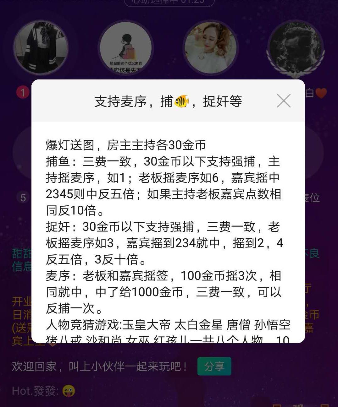 而在语音直播软件还有很多“游戏类”的房间,一般有“麦序、捕鱼、十一点、斗牛”等玩法。这些“小游戏”一般都基于房间里的表情插件,通过摇骰子、要麦序的方式在玩家和嘉宾中展开,根据提前约定好的规则,进行比大小,输赢则以刷礼物的方式进行结算。