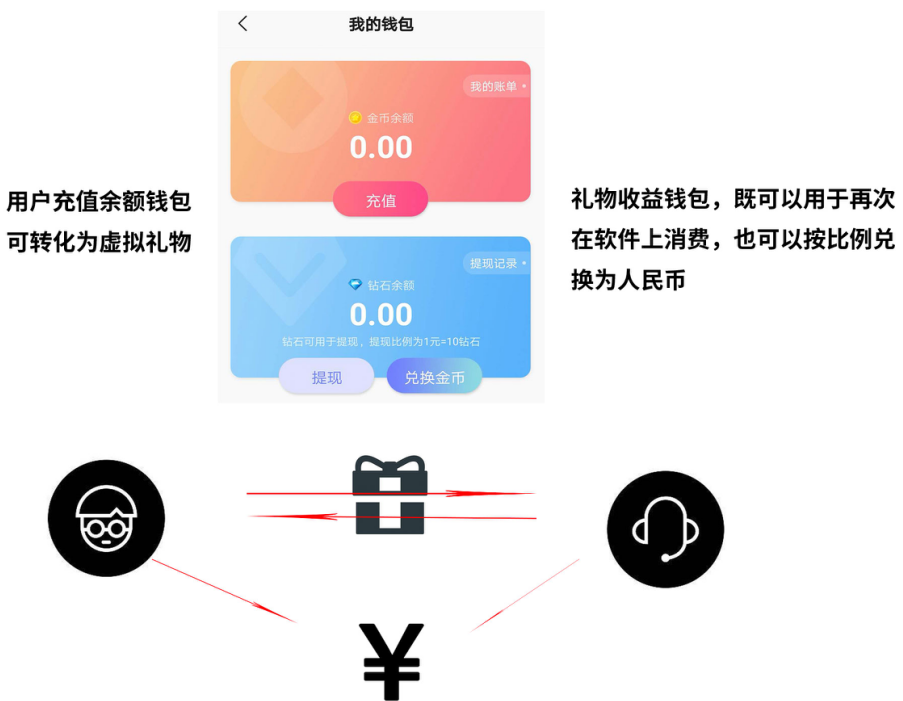 在其公司的服务协议内明确写道,虚拟金币不能兑换成人民币。但在实际操作中,虚拟金币却通过礼物的形式,摇身一变成为“虚拟钻石或金币”,以主播收益的形式流通,最终通过支付宝提现,兑换成人民币。
