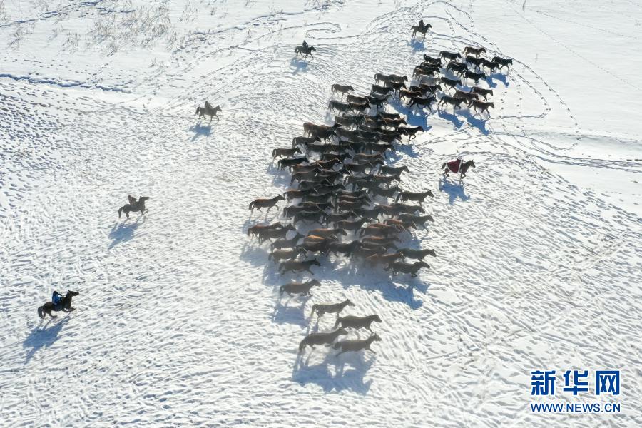 这是12月31日在昭苏县天马旅游文化园拍摄的驰骋的骏马(无人机照片)。新华社记者 赵戈 摄