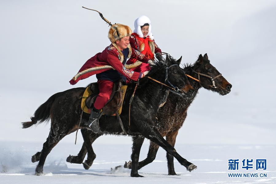 当地牧民在昭苏县天马旅游文化园为游客表演“姑娘追”(12月20日摄)。新华社记者 丁磊 摄