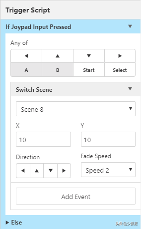 要添加开关脚本,你需要先添加一个开关,随后在右侧选择「添加事件」。与人物互动需要玩家按下按键,而默认情况下,只要人物站在开关上,它就会启动。因此,如果你希望让玩家在按下按键后才开始互动,则需要在脚本中加上「当玩家按下按键」(If Joypad Input Pressed),并将互动脚本放置在这个 If 条件中。