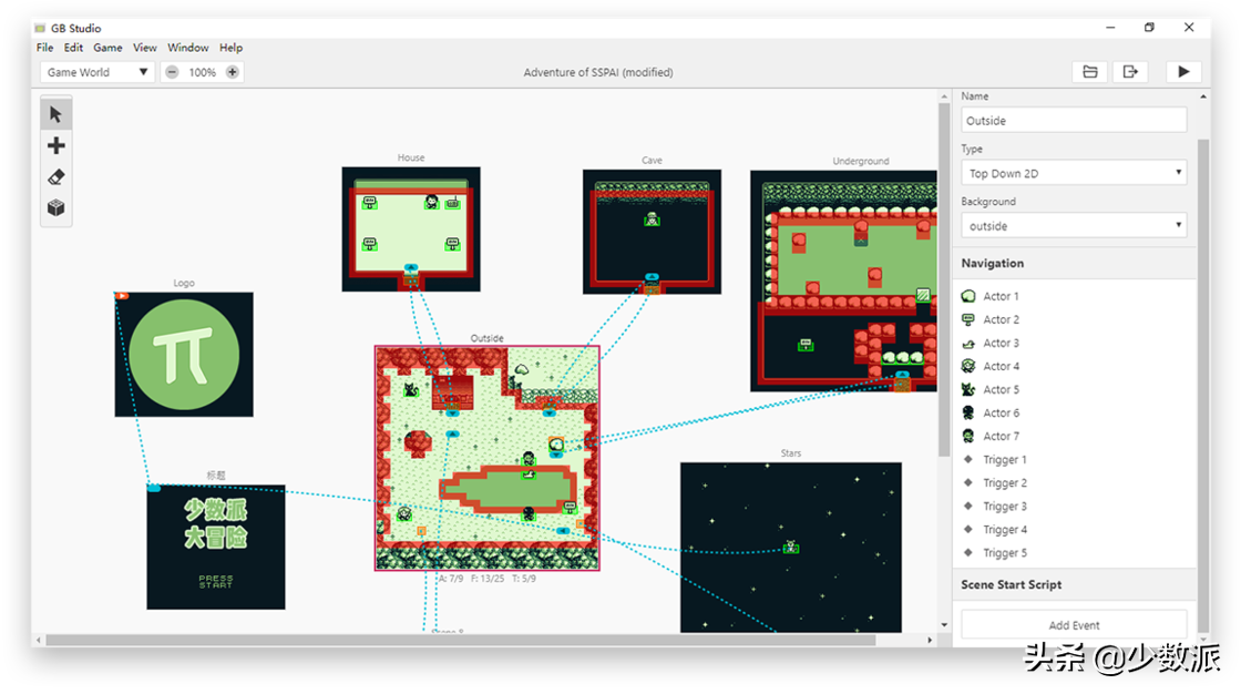 GB Studio 的界面非常直观,新建一个项目后,摆在你眼前的就是整个游戏的故事板。你可以在故事板上看到包括 Logo、开始界面在内的所有场景。点击场景或内容物即可在右侧修改其属性,或是为其添加脚本。