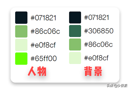 GameBoy 的屏幕仅支持显示四种灰度,因此在绘制素材时,我们也要谨记这一点。官方文档为背景素材提供了四种可以使用的颜色:#072821(黑色)、#306850(深绿)、#86c06c(浅绿)、#e0f8cf(白色),人物素材在这四色的基础上,删掉了 #306850(深绿),加上了 #65ff00 用于表示透明色。