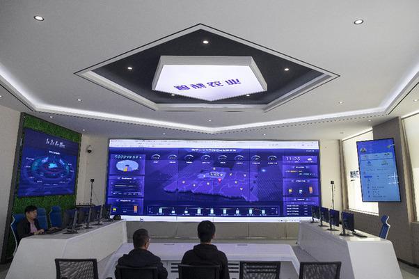 5月11日,在北大荒集团红卫农场有限公司智慧农业中心内,工作人员查询无人驾驶插秧机的工作情况。新华社记者张涛摄