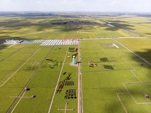 这是2020年8月21日拍摄的富锦市万亩水稻公园中的稻田画(无人机照片)。新华社记者张涛摄