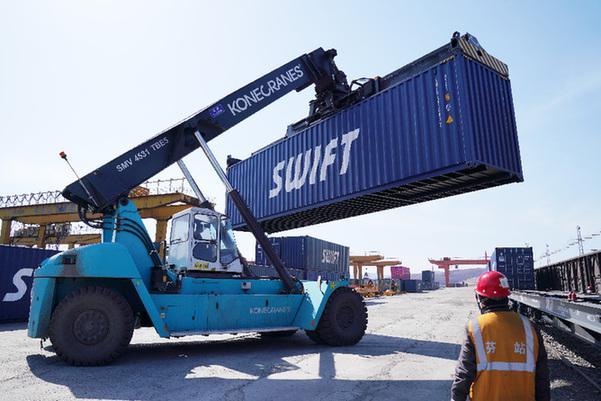 在绥芬河站北场,工作人员在对入境的中欧班列进行换装作业(4月1日摄)。新华社记者王建威摄