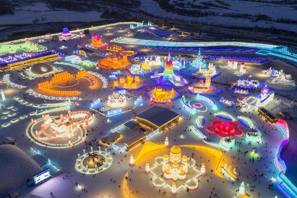 这是2020年12月31日拍摄的哈尔滨冰雪大世界园区一角(无人机照片)。新华社记者谢剑飞摄