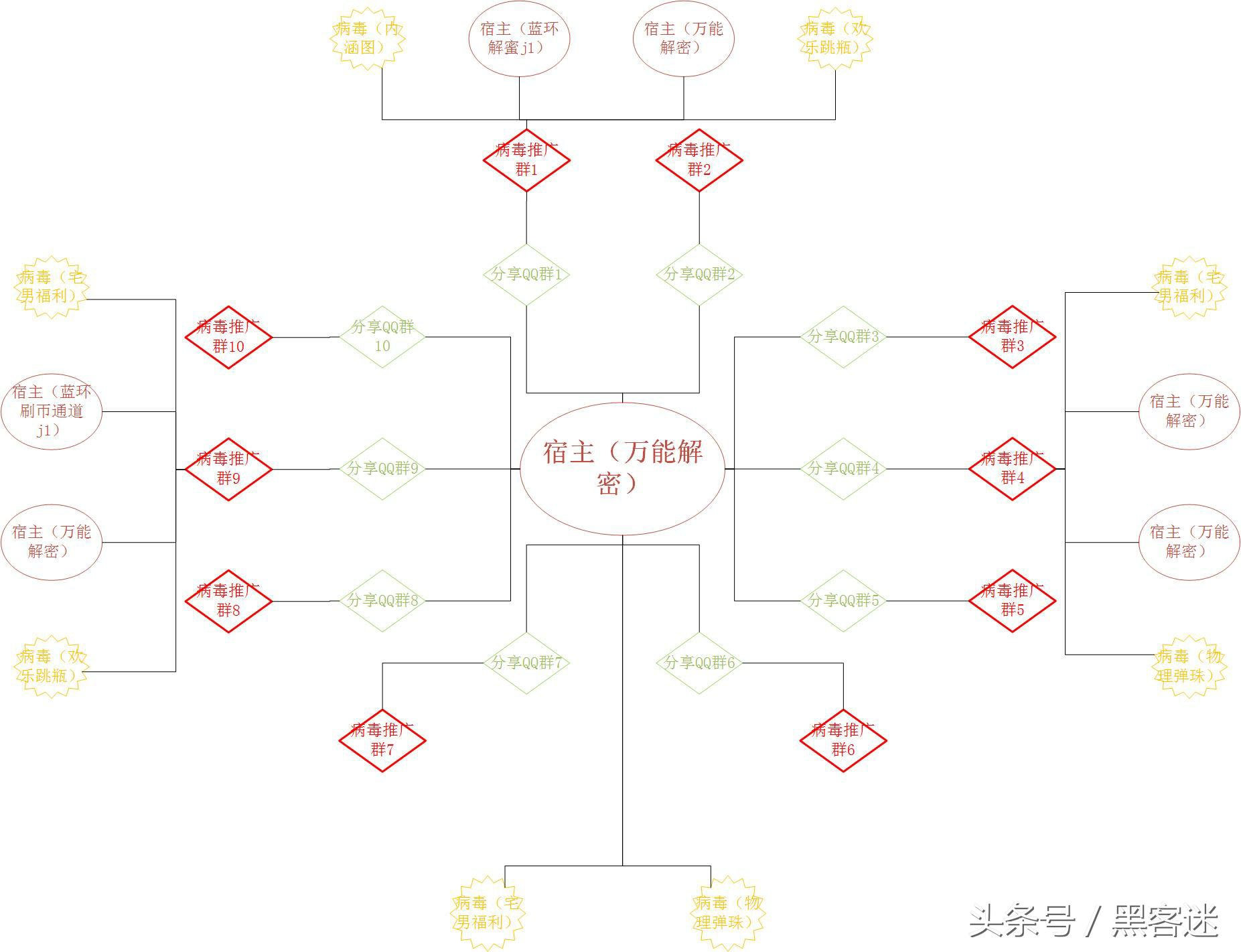 从一个“宿主”软件出发,设定1个用户被骗,此用户会直接从“宿主”推广中下载1个病毒软件;之后此用户为了查看破解成功的密码,进行了10个QQ群的分享;在群分享信息中,包含了病毒推广群的信息,以最小基数设定,假设每个分享群中有1个用户进入了病毒群;在每个病毒推广群消息“邀10人进群给50元”中,有1人受骗,邀了10人进群;在每个病毒推广群文件中平均有2个不同变种的“宿主”软件和2个病毒软件,从1人受骗,到10个分享群每个1人受骗,再到病毒推广群每群1人受骗邀请10人进群,共受骗人数合计111,病毒和“宿主”使用次数444人次。看似数字很小,但是在这个流程推算中,我们一直假设的是最小基数1。为了更直观的看到它的传播途径和扩散量,下面使用简单的流程图进行表示,如图2-1所示: