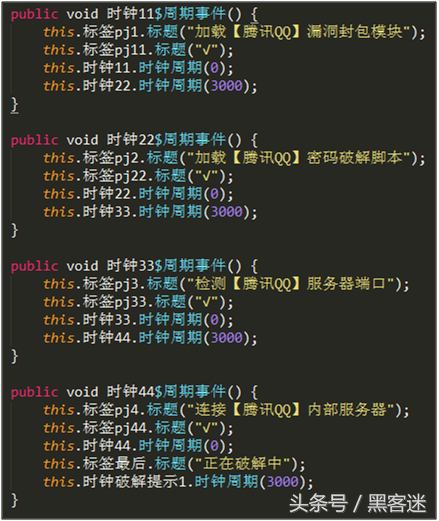 随后我们使用测试号试用一下,会发现在进度日志框中,正在“加载腾讯QQ漏洞封包模块”、“加载腾讯QQ密码破解脚本”、“检测腾讯QQ服务器端口”……,那么是否真的如它所说,在执行这些操作呢,我们进入源码一探,发现这其实也是一种诱诈欺骗。虚假操作日志软件交互界面和实现源码,如图3-3、图3-4所示: