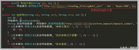 接下来的事乍看之下更加令人震惊,如果不是一名技术人员,真的要被骗了,等密码显示已破解成功时,密码为**********,虽然密码看不到,但是我们的头像已经赫然显示了出来,怀着质疑的心理我们继续扒代码,结局也是无比震惊。它使用了某厂的获取头像的api接口http://**.***.**/headimg_dl,在此也希望为了用户的隐私安全,能够对其采取一定的安全防护措施。获取QQ头像的软件交互界面和实现源码,如图3-5、图3-6所示: