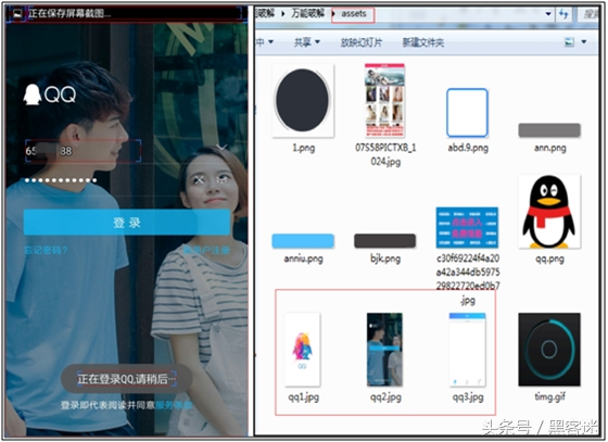 在显示破解成功之后,为了进一步获取用户的信任,软件假意尝试登录QQ,用户看来,它会打开QQ,进行登录操作,发现真的提示登录成功了。作为技术人员的我依旧不信,来到源码中,我发现所为的打开扣扣登录,不过是加载提前准备好的QQ登录界面为背景,将你要破解的QQ显示在上面,为了大家一眼看破它的骗术,这里将手机的开发者选项中显示布局边界模式打开。QQ登录界面和应用资源文件,如图3-7所示: