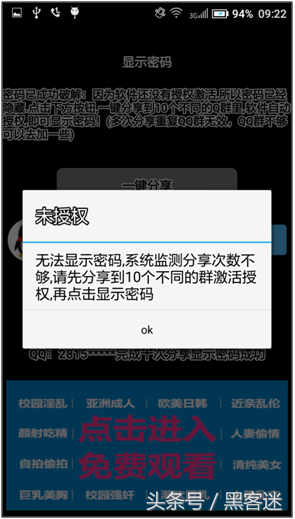 首先,提示密码获取成功之后,用户看到的是*字符,软件提示用户,如果需要获取密码,则必须分享信息到10个不同的QQ群,诱导分享的软件交互界面,如图3-8所示: