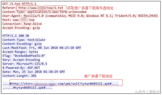 经过研究和测试,发现用户点击下载之后,并不能时常如愿,下载得到的病毒软件可能是色情软件,也可能是游戏类软件等,它的下载地址是动态的从服务器端获取得到的,通过技术手段得到它的服务器地址是http://www.******.cn/1.txt和备用地址http://www.******.top/1.txt,获取协议包的内容,可以获取推广病毒软件的下载地址http://store.*****.com/apk/self/tytan0605111.apk,此病毒下载地址为动态的变化地址,一般根据响应体中的应用名变化,如图3-13所示: