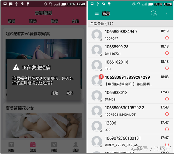 我们分析一款名称为“宅男福利社”的推广软件,经过研究人员研判,该软件主要具有以下主要恶意行为。软件运行后,请求发送短信,删除短信,获取联系人等权限,之后私自发送短信订制扣费业务,具有恶意扣费属性;软件运行期间,监听用户短信,获取用户联系人和电话,具有隐私窃取属性。