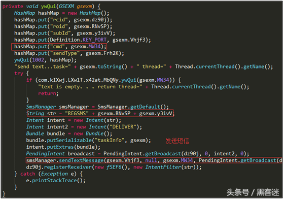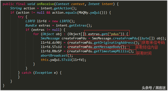Android中监听用户短信,一般需要申请权限—注册广播接收者—监听解析短信内容,这里我们只做简单分析,从源码中获取到短信监听的恶意代码,如图4-4所示: