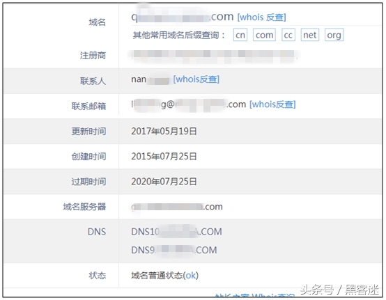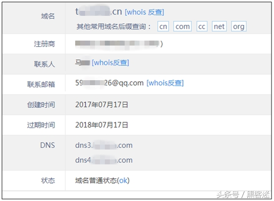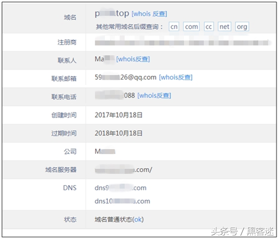 如果要做到病毒的下载推广,信息的动态获取,必定依赖于服务器,针对病毒软件中的服务器地址和备用地址,我们对注册域名者进行溯源追踪,为了信息安全,我们对所有敏感信息进行了技术处理。“宿主”软件中主要有两个域名,分别是t******.cn和p***.top;推广病毒服务器下载地址的域名主要是q******-***.com。下面我们对三个域名分别进行whois查询。