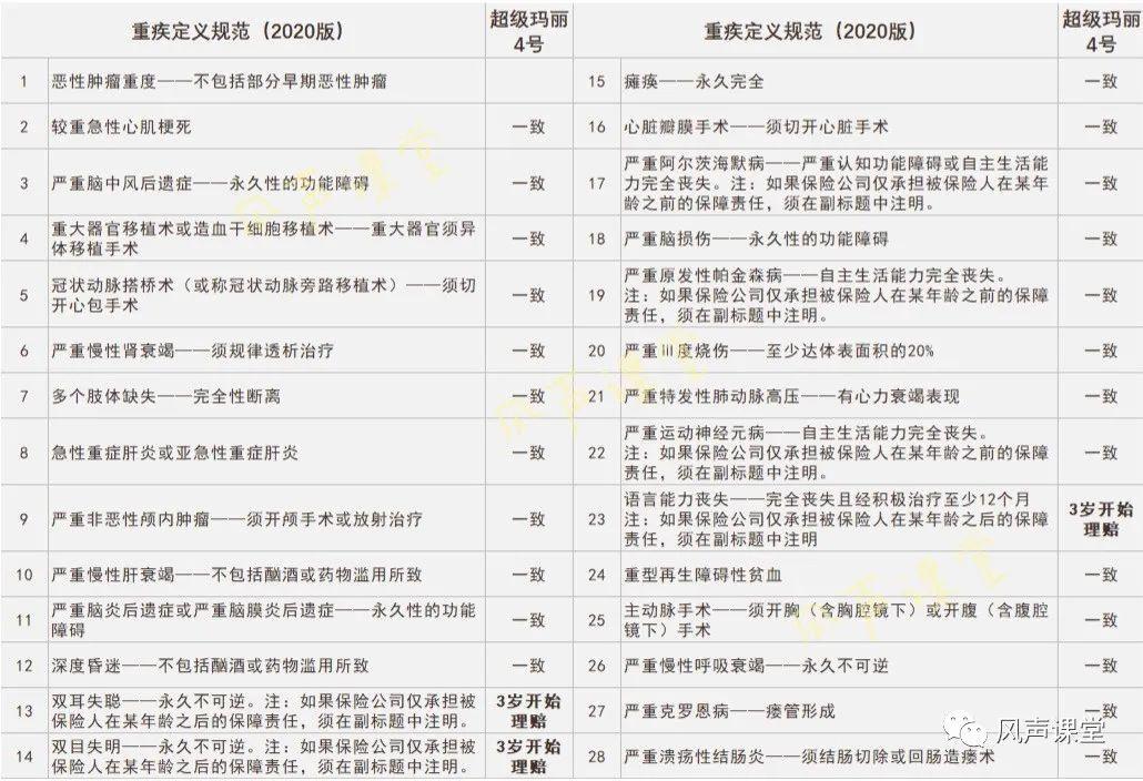 以上28种重疾是重疾使用规范(2020版)统一定义的疾病,包含了高发的所有重疾种类,保险公司仅可做有限的年龄限制。与重疾使用规范(2020版)对比,超级玛丽4号与规范完全一致,虽然对双耳失聪、双目失明和语言能力丧失等3种重症对理赔年龄做了限制,但仍在规范允许的范围内。