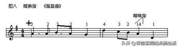 8、暗换指法(也称“哑换”):两音之间音域较宽时,出于对乐句流畅的要求,采用的一种指换但音不断的弹奏方法。采用这种指法时需注意的是,换指时所按的那个音的时值不宜过短,如图八。