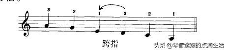 3.跨指法,当高音向低音方向进行时,将2、3、4(5指一般不用)其中的一个手指从拇指上方跨越,以保持旋律的连贯和流畅。谱例如下。