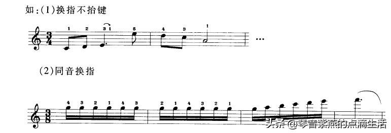 6.同音换指法,分两种。一种是暗换指,换指时按住键不抬起,专用于大音程跳动的手指转换;另一种是同一个音用不同手指的快速转换,具体参看谱例。