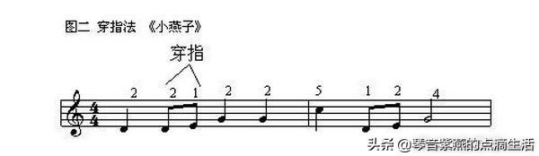2.穿指法,该指法为拇指专用。当低音向高音方向进行,为保持乐句的连贯性,拇指(1指)从2、3、4指下方穿过并弹奏。即将拇指从二或三、四指下面穿过去,使手指的把位上移的一种指法,如图二。