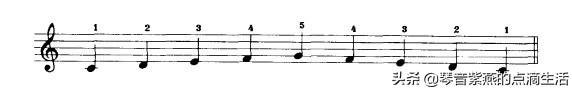 1.顺指法,它是最基本也是最简单的指法,使用频率也最高,其弹法是五个手指固定在某一个把位(狭窄的音区)不扩指缩指,也不穿指跨指,按照顺序弹奏。通俗的说就是,当一个乐句能够用一个把位弹出来时就用顺指法。(一般音域在五度内)这种指法手指间距小,无须伸张,使手型保持自然松弛的状态。这是一种应用最多的指法,如图一。