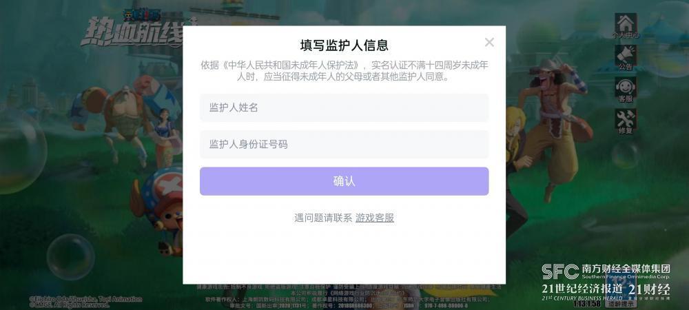 (图说:《航海王热血航线》提示不足十四周岁的未成年人提供监护人的姓名和身份证号码。)
