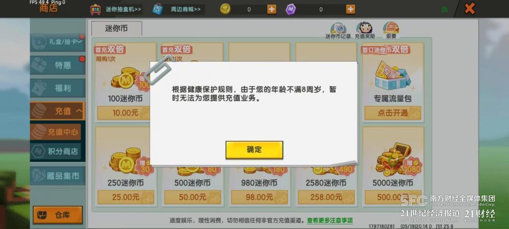 (图说:《迷你世界》防沉迷模式下禁充弹窗。)