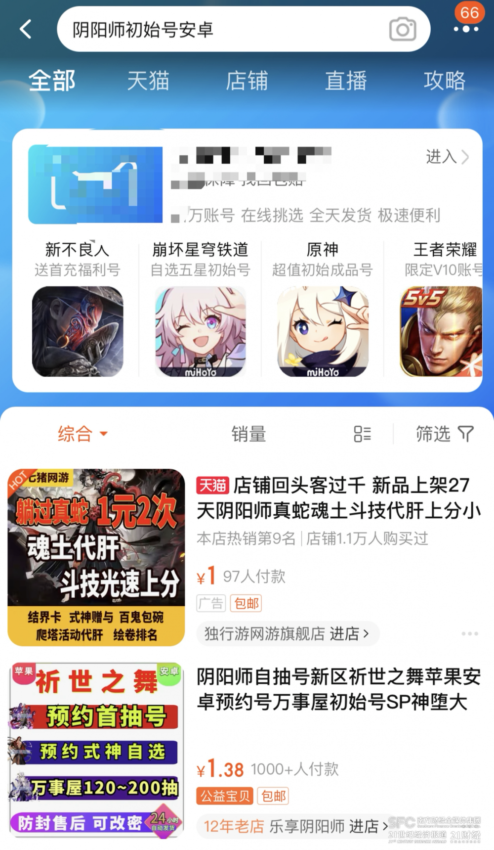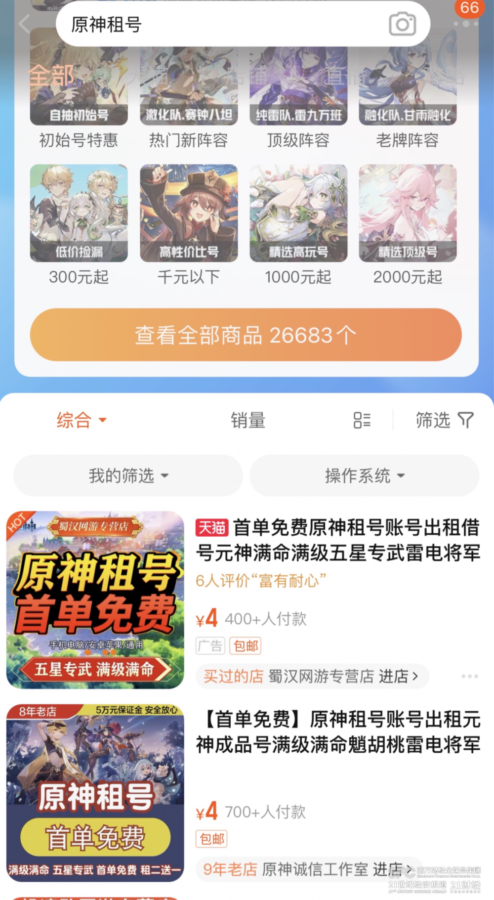 实测过程中,研究员在电商平台中输入上述关键词,可出现大量租卖游戏账号的店铺。据观察,这些账号购买或租赁价格都颇为低廉,如“初始号”“自抽号”(等级不高,跳过游戏新手流程)的价格在10元-30元不等,租号价格最低在每小时6元不等。