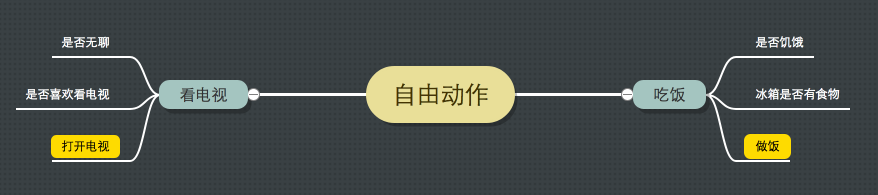 如上图所示,黄色矩形为执行节点,白色字体为为条件节点。模拟人生人物在“吃饭”这一组合节点中,首先要判断自己是否饥饿、冰箱里是否有食物,如果结果都是“是”,就会执行做饭这一行为。