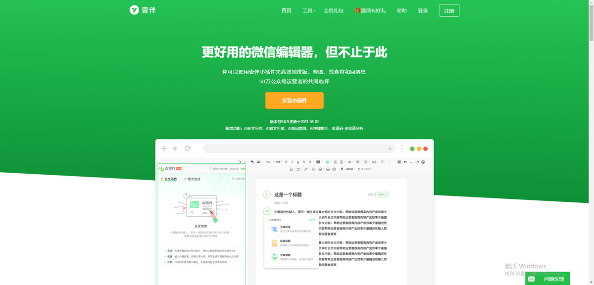 整体的界面还是很简洁的,但是需要安装插件且需要绑定微信公众号,AI可以生成一些简单的软文,写作的时候更加快捷,壹伴插件这种就相当于给公众号后台装了一个外挂!排版模板相对较少!