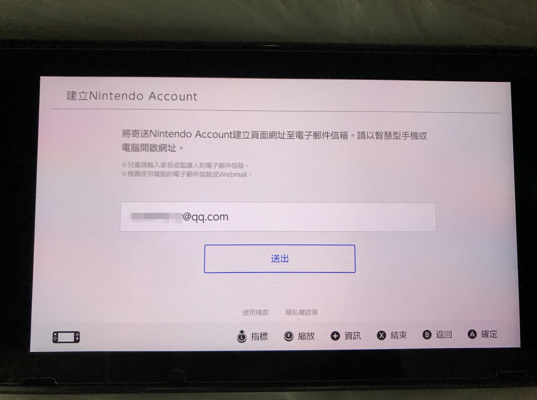 填写你的邮箱地址,选择送出。此时先不要关闭或者后退NS上显示的页面,先放到一边。