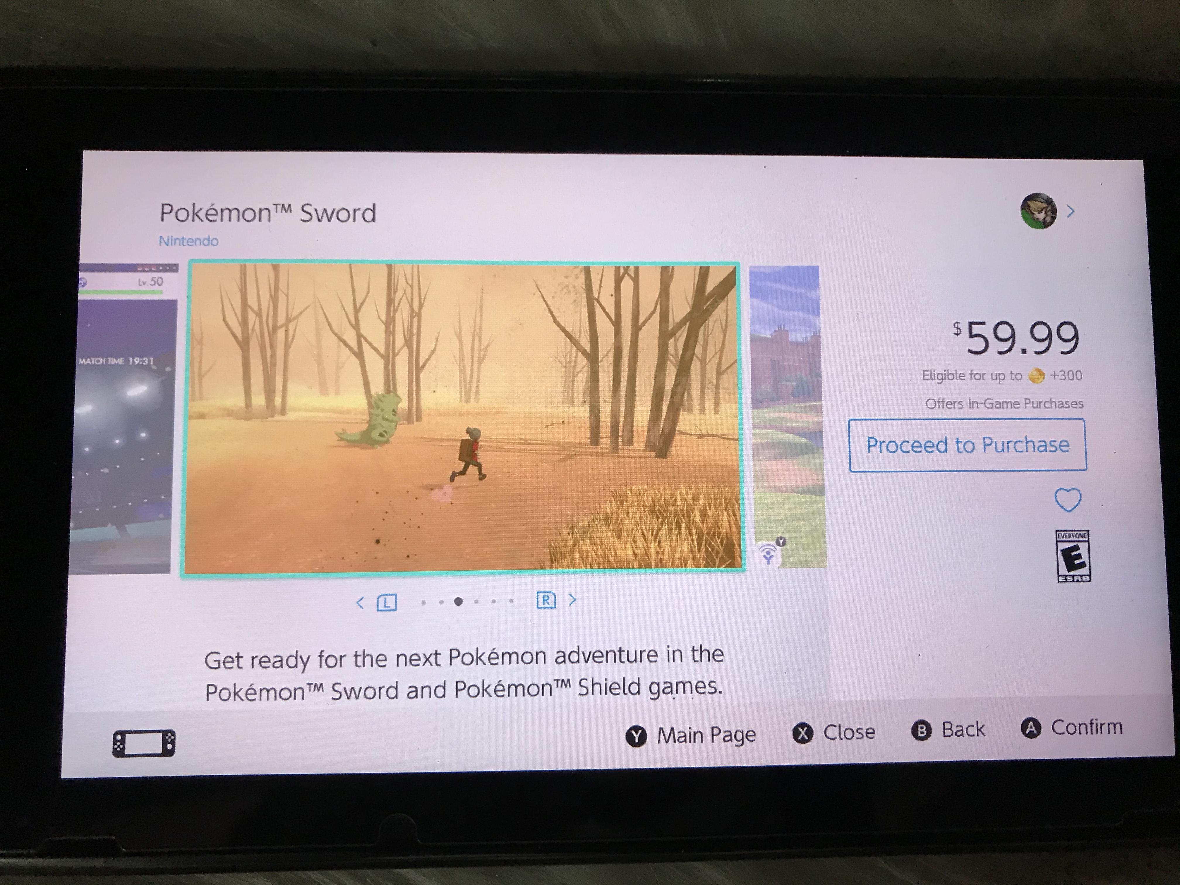 找到我们想买的游戏之后,点击进入,可以看到游戏的详细说明,比如美服的《精灵宝可梦:剑》也是支持中文的。右侧59.99刀为游戏售价,下方长条的Proceed to Pruchase就是购买,在其他服,确认购买都是要点击这个长条按键的。
