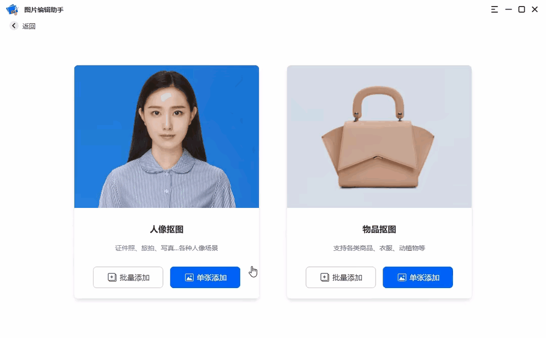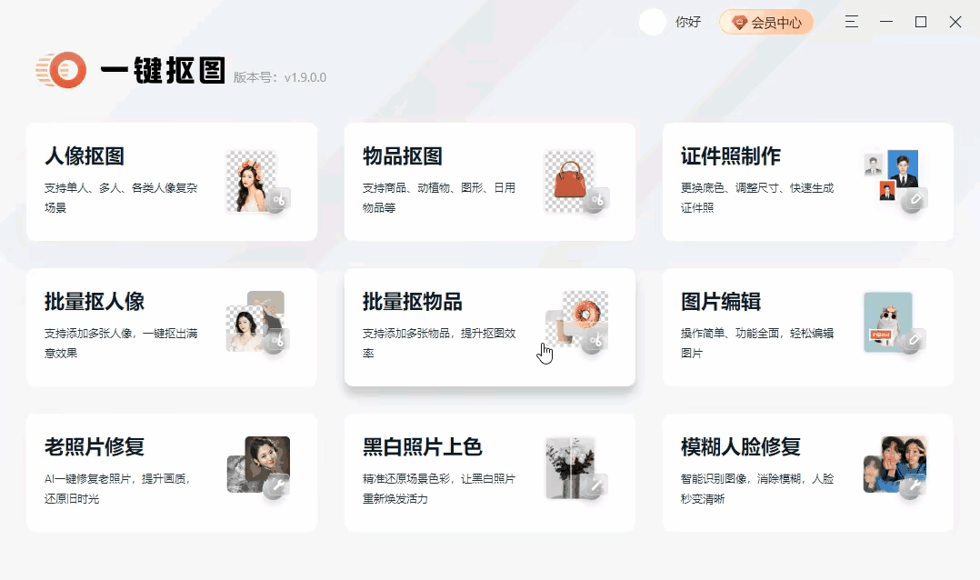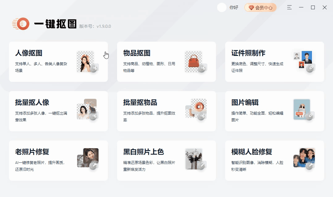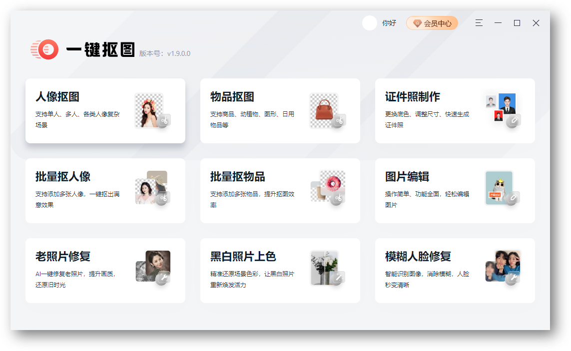 我们先说一下,第一款神器,就是电脑上的一键抠图,可是直接在网上搜索就能找到,主要功能有人像抠图、物品抠图、老照片修复等。
