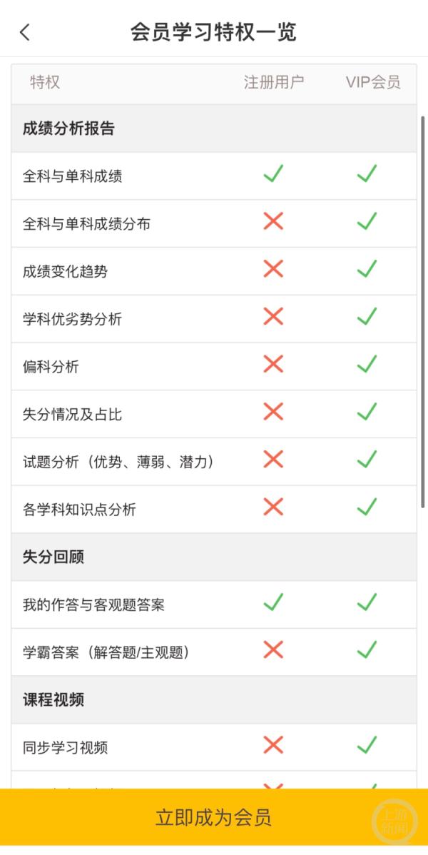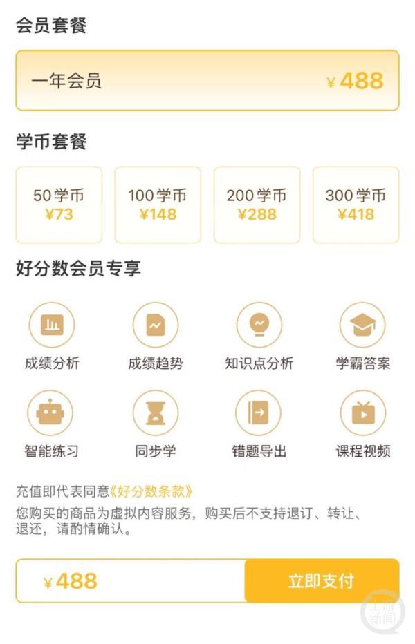 记者看到,在“好分数”APP家长版的用户页面上,可选择购买“VIP会员”,一年会员价格488元,还有73元、148元、288元、418元的不同价位“套餐”。“会员学习特权”介绍页面显示,未付费注册用户可查看“全科成绩与单科成绩”“作答与客观题答案”,而“全科与单科成绩分布”“成绩变化趋势”“学科优劣势分析”等功能需付费购买会员后使用。